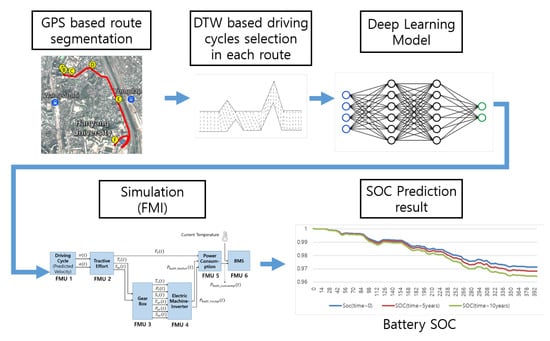 An accurate prediction of the State of Charge (SOC) of an Electric Vehicle (EV) battery is important when determining the driving range of an EV. However, the majority of the studies in this field have either been focused on the standard driving cycle (SDC) or the internal parameters of the battery itself to predict the SOC results. Due to the significant difference between the real driving cycle (RDC) and SDC, a proper method of predicting the SOC results with RDCs is required. In this paper, RDCs and deep learning methods are used to accurately estimate the SOC of an EV battery. RDC data for an actual driving route have been directly collected by an On-Board Diagnostics (OBD)-II dongle connected to the author’s vehicle. The Global Positioning System (GPS) data of the traffic lights en route are used to segment each instance of the driving cycles where the Dynamic Time Warping (DTW) algorithm is adopted, to obtain the most similar patterns among the driving cycles. Finally, the acceleration values are predicted from deep learning models, and the SOC trajectory for the next trip will be obtained by a Functional Mock-Up Interface (FMI)-based EV simulation environment where the predicted accelerations are fed into the simulation model by each time step. As a result of the experiments, it was confirmed that the Temporal Attention Long–Short-Term Memory (TA-LSTM) model predicts the SOC more accurately than others.