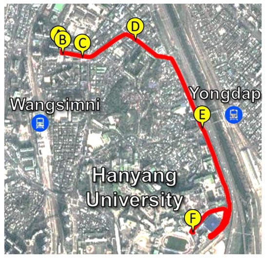 The tested driving routes run from a fixed site to the other, i.e., from the homeplace of one of the authors to a parking lot in the Hanyang University campus. The route consists of several intersections between the start point and the destination point. The driving data were collected onboard while the author was driving, using an application named Torque Pro running on an Android device connected to a Bluetooth dongle, which supports the OBD-II specifications. The OBD data were comprised of various second-by-second temporal data, such as GPS latitude, longitude, velocities, etc., and were saved in a Comma-Separated-Value (CSV) format. The route is highlighted, as shown in Figure 2. The route was extracted and drawn on the map using the Google API with the GPS latitude and longitude information from the OBD data.
