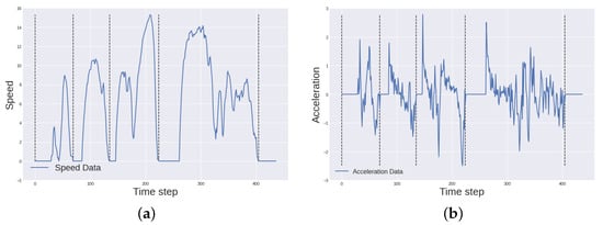 Figure 3. Speed and acceleration over time of the base time series. (a) Speed × time of the base time series. (b) Acceleration × time of the base time series. - Secondly, the base time series may further be split into an arbitrarily number of base segments. Considering the Figure 2 and Figure 3, the markers from A to F and the dotted black vertical lines represent situations in which the velocity of the car reached zero or, in other words, the start and the end points of each of the four segments (A to C, C to D, D to E, E to F). Note that the point B was not taken into account, because we regarded it as noise due to its proximity to point A, and that the each of the base segments are shown in greater detail in the subfigures of Figure 4.