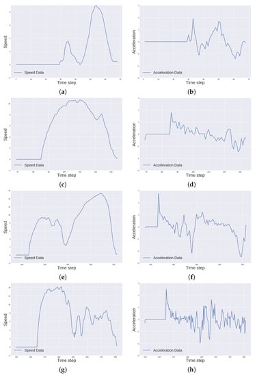 Figure 4. Speed and acceleration over time of the four base segments. (a) Speed × Time (A to C segment); (b) Acceleration × Time (A to C segment); (c) Speed × Time (C to D segment); (d) Acceleration × Time (C to D segment); (e) Speed × Time (D to E segment); (f) Acceleration × Time (D to E segment); (g) Speed × Time (E to F segment); (h) Acceleration × Time (E to F segment). - Thirdly, for each of the four base segments, we set the lower bound and the upper bound times for the similar patter- finder algorithm by subtracting and adding an arbitrary small amount of time. For example, the second base segment was extracted from second 69 to 135 of the base time series. If , then the lower-bound and upper-bound times for a similar pattern-finder algorithm will be, respectively, 19 s and 185 s, as shown in Table 1.