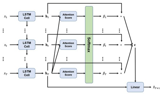 Recently, researchers have proposed multiple attention mechanisms for time series tasks and achieved better results than LSTM and GRU [37,38,39]. Inspired by the dynamic spatial–temporal attention mechanism [39], we employ the temporal attention mechanism to predict the acceleration of EVs in this work, since our task is univariate time series forecasting, which does not require consideration of spatial attention. Therefore, the temporal attention mechanism assigns a weight to each hidden state by correlating the output at each time step with the output at the last time step. Intuitively, for the prediction of the next time step, the current state is very important, but we cannot ignore the state of previous time steps. A general RNN-based prediction model either uses a fully connected layer to connect the hidden states of all time steps, giving a relatively accurate view of the hidden states of all time steps, or uses the last hidden state for prediction. However, we believe that temporal attention chooses the balanced option of adaptively attributing all time steps an attention score according to the relevance of different time steps to the state of the last time step, and finally connecting the fused context vector with the last hidden state for prediction, which, in turn, enhances the contribution of the current state to the prediction of the next time step.