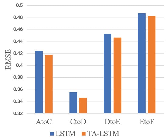 Then, to verify the effectiveness of temporal attention, we compared the LSTM with TA-LSTM. The training process and the allocation of training and test sets are the same as in the previous experiment. The results of the comparison are depicted in Figure 6. The comparison shows that the addition of temporal attention yields better results.