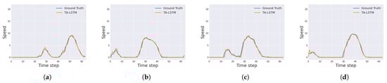 First, to verify that the LSTM in TA-LSTM is the preferred encoding layer, we compared LSTM and other RNN variants on four road segments of the dataset. RNN and GRU are commonly used for time series forecasting, and all three models follow the five-fold CV approach introduced in the previous section to identify the best combination of hyperparameters. All three models obtained the minimum average RMSE at . The first seven driving cycles of each road segment were used as the training set and the remaining four driving cycles were used as the test set, and each road segment was trained and tested separately. In addition, 20% of the data in the training set were randomly selected as the validation set during the training process, and the best-performing model in the validation set was saved for testing. The best test results for each model after training multiple times are shown in Table 4, as can be seen in Table 4, LSTM performs the best in all four road sections. Therefore, we choose LSTM as the coding layer in this task.