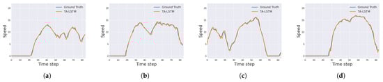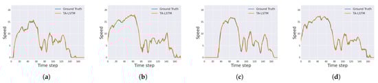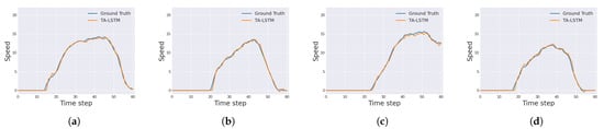 Since temporal attention can be combined with various variants of RNN, we compared the performance of different encoding layers combined with temporal attention. From Table 4 and Table 5, it can be seen that adding temporal attention to all three different encoding layers can improve the prediction accuracy. TA-LSTM has the best performance. Therefore, we chose TA-LSTM for the task of predicting speed. The comparison between the predicted and true values of each driving cycle for each road section is shown in Figure 7, Figure 8, Figure 9 and Figure 10. As can be observed from these figures, our model can fit the real data very well in most cases.