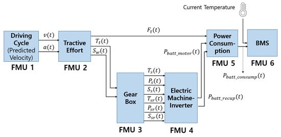 We used FMI-based EV simulation with the previously predicted velocity and acceleration as inputs to predict the EV’s SOC. Our EV Simulation model is shown in Figure 11. As can be seen in the figure, given the inputs, the FMU2 to FMU6 are responsible for computing the SOC using the Formulas (14)–(38), whose variables are detailed in Table 6. Additionally, the lookup2d function in Formulas (29)–(31) performs the same operation as lookup2d in MATLAB/Simulink. The necessary efficiency values of the electric machine were obtained through the efficiency curves given in [9].