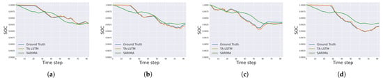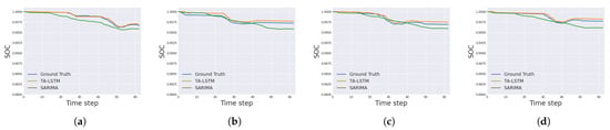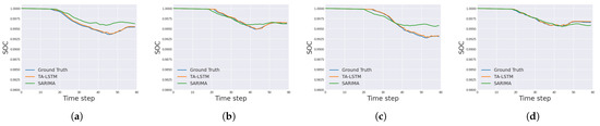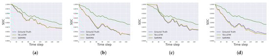 To verify the effectiveness of our speed prediction model for the final SOC prediction, we compared the proposed model results with the speed and SOC prediction obtained with the Seasonal Autoregressive Integrated Moving Average (SARIMA) model. The final SOC prediction results are shown in Table 7. As can be seen from the table, the RMSE of TA-LSTM drops 56.69%, 84.97%, 82.34%, and 91.62% compared to SARIMA in the AtoC, CtoD, DtoE, and EtoF sections, respectively.