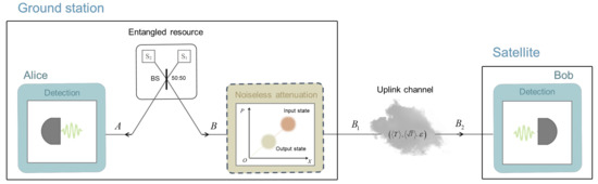 For the convenience of security analysis, the uplink CV-QKD protocol is structured with the equivalent entanglement-based (EB) scheme [27]. As shown in Figure 1, Alice generates a two-mode squeezed vacuum (TMSV) state as an entangled resource, which can be represented by its covariance matrix