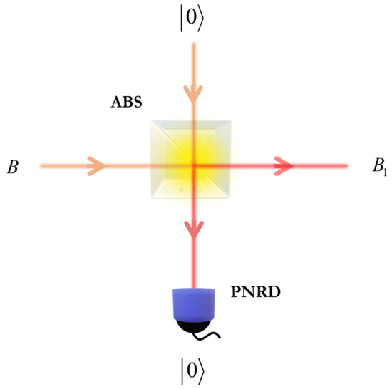 Due to the limited size of the quantum satellite, an enhanced source preparation scheme at the ground station becomes a feasible solution. Motivated by characteristics of the source preparation [23,24,25], we apply a suitable NA operation before transmission for performance improvement (see Figure 1). In this section, the NA-based source preparation is realized via the ZPC operation, which can be implemented by mixing zero photon at an asymmetrical beam splitter (ABS) and then post-selecting the ABS output by conditional detection of zero photon (see Figure 3). For the TMSV state, the catalyzed mode (mode B) is sent to one of the input ports of ABS with transmittance , while a zero-photon ancillary Fock state incidents on another port for interference. In an ideal case, the auxiliary zero-photon state will not be destroyed at all and the photon number resolving detector (PNRD) at the corresponding output ports can register zero photon. Therefore, the ZPC-involved attenuation happens to be a zero-energy-input attenuation that does not cause the consumption of external energy. Mathematically, the ZPC process can be regarded as an equivalent operation given by
