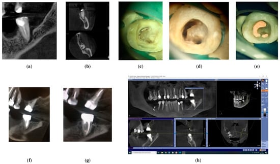Clinical case 1: (a,b) preoperative CBCT demonstrates radiolucent lesion on the distal aspect of the second left mandibular molar; (c) clinical view of the access cavity, remnants of obturation material; (d) clinical view of the access cavity after instrumentation of the root canals; (e) clinical view of the access cavity after obturation of root canal treatment with GuttaFlow Bioseal; (f,g) postoperative CBCT demonstrates complete root canal filling; and (h) a follow-up CBCT (after 12 months) demonstrates healing.