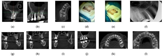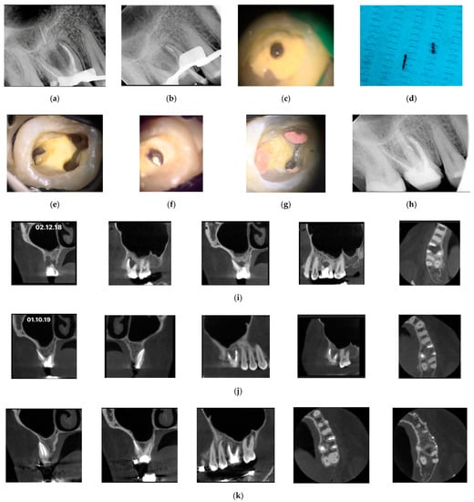 (a,b) Preoperative periapical radiographs of the first upper molar, presenting the “bone” defect as a radiolucent area with irregular contour in the apical region and in the bifurcation region. (c,d) Stages of removal of fragments of endodontic instruments from the buccal medial and palatal canals. (e) Tooth appearance after instrumentation of the root canals. (f) Introduction of BioDentin into the palatal canal. (g) Root canal obturation. (h) Postoperative periapical radiograph. (i) Diagnostic CBCT. (j) Follow-up CBCT 11 months later. (k) Follow-up CBCT 24 months later.