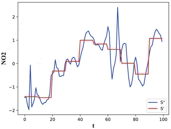 Figure 1 shows an example of the transition of NO from the original numerical MTS () to the PAA version of MTS (). Here, and . This way, the dimension is reduced from 100 to 10.