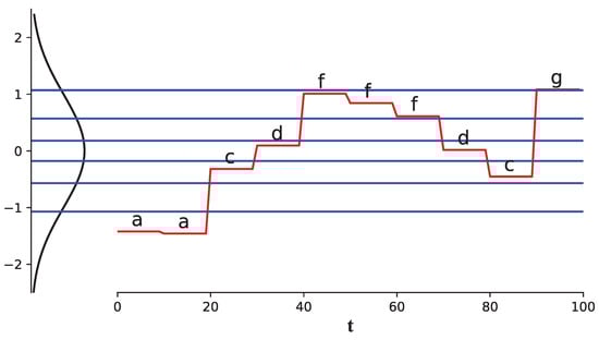 The SAX-MTS also has a similar form to Definition 2. The only difference is that the numerical value is transformed into a symbolic one. To produce symbols with equiprobability, a set of breakpoints dividing the area of under the probability distribution function (PDF) of is required. Therefore, let containing g symbols; then, we have: