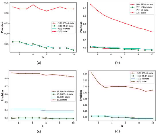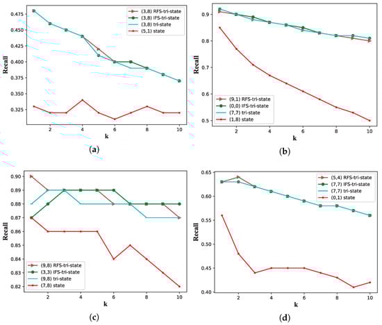 Figure 4 and Figure 5 show the meaning of precision, recall, and F1-measure for four kinds of states on the four datasets’ test sets. Commonly, the form , , indicates the indices of row and column metrics, respectively. For example, means that the row metric is Levenshtein and that the column metric is Jaccard. Second, with increasing k, the precisions of the state, tri-state, IFS-based tri-state, and RFS-based state are decreased. Third, the precision of state is better than that of the others. Moreover, the precision of tri-state is slightly better than that of the IFS- and RFS-based ones. The precisions of the IFS- and RFS-based tri-states are almost consistent. This is because three kinds of tri-states provide two additional symbols for each variable. However, tri-state may be incomplete while the IFS- and RFS-based ones are complete. Therefore, the precision of the tri-state is between the state and the IFS- and RFS-based tri-states. This can be observed in Figure 4b,c.
