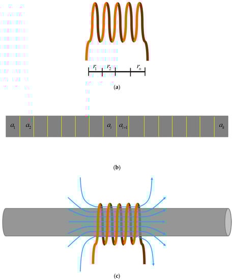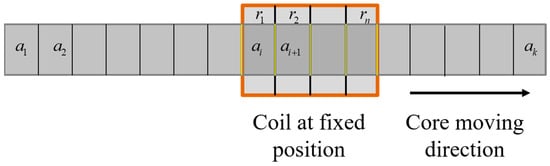 The acquisition of NMR data is illustrated in Figure 1a–c. The whole core is characterized by fluid content function , and the coil is characterized by the response map function . is the coordinate along the axis of the core and the coil, respectively. During NMR measuring (Figure 2), the core is moving to the right while the coil is at the fixed position. At each location of the core, an NMR signal is measured. Assume the fluid content in the core is digitized into k samples, and the response function is digitized into n samples. The relationship between the ith sample of NMR signal and the fluid contents can be connected by the following discrete linear equations
