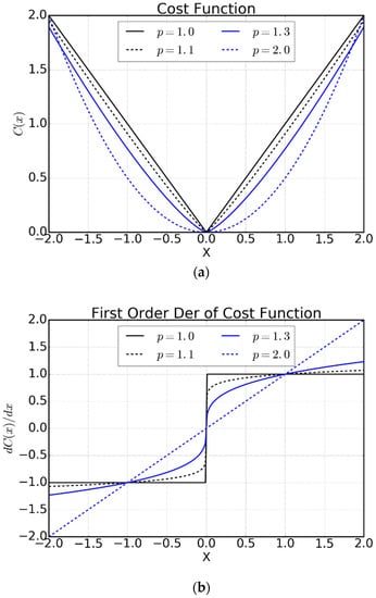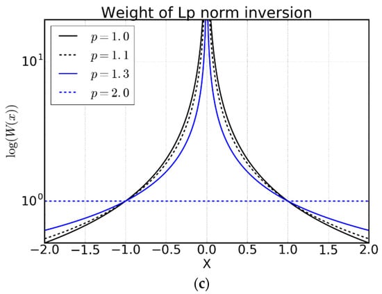 Figure 3 shows the cost functions, their first-order derivatives, and the weights for different values of p. The first-order derivative, which plays the same role as the influence function [25], needs to increase not so rapidly for large errors for the sake of robustness. From Figure 3c, we can see that as p decreases, Equation (15) puts more and more weight on the small value of residuals, the residuals of the data measurements with smaller deviations. As the errors of data measurements increase, for small values of p, the weight decreases quickly, therefore reducing their impact on the inversion. This is contrary to the case of p = 2, where the weight is one.