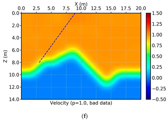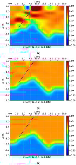The p values used in the inversions in Figure 7 are all 1s, and the unreliable data measurements have been removed. According to Figure 3c and Figure 4, slightly larger values of p can still be used if all the data samples follow the normal trend, which can be predicted by Equation (8).