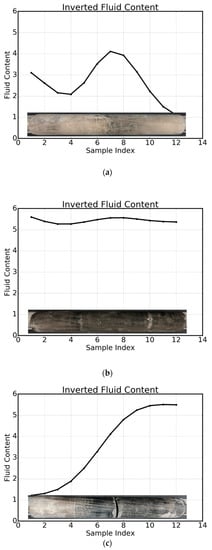 Figure 8b,d show the inverted fluid content using different values of p using the non-pre-processed data, and they are compared with those using pre-processed data (solid red curves). For core A, since the erroneous data is slightly different from the major trend, there are no large differences between the inverted results with different p’s. This indicates that for sufficiently well-prepared data, L2 inversion shall be able to provide reasonable results.