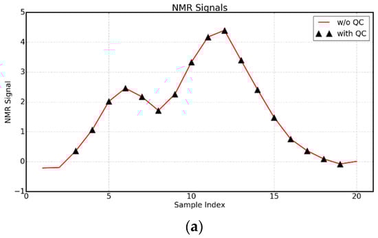 Figure 8a,c show the NMR measurements for two cores, core A and core D. Both the pre-processed (curves with triangles) and non-pre-processed (red curves) NMR data are plotted. For core A, the first two and the very last data points are negative (but with a small magnitude). For core D, the first two data points show significant deviations from the rest.