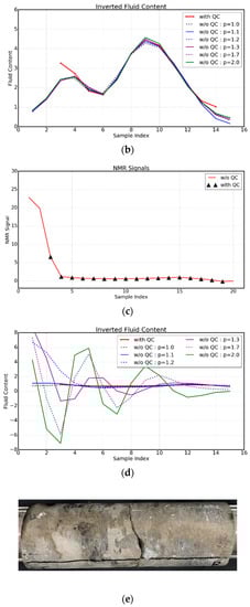 (a) The NMR measurements of core A with and without quality control. (b) Inverted fluid contents for core A using p = 1.0, 1.1, 1.2, 1.3, 1.7, and 2.0. (c) The NMR measurements of core D with and without quality control. (d) Inverted fluid content for core D using p = 1.0, 1.1, 1.2, 1.3, 1.7, and 2.0. (e) Photo of core D.