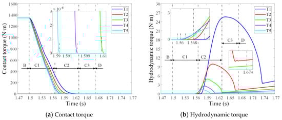 - The contact torque decreased in the disengaging process, and the increase of ATF temperature significantly promoted its decrease (promoted by 91.2%). The hydrodynamic torque first increased sharply, then decreased significantly, and finally increased slowly after fluctuation during the disengaging process, and was dramatically reduced by the increase of ATF temperature (reduced by 94.7%).