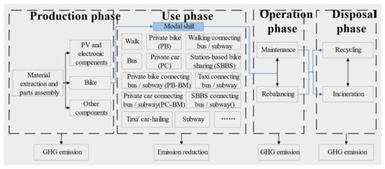 The emergence of FFBS provides new ideas for reducing greenhouse gas emissions and promoting urban sustainable travel [,], which is of great significance to achieve the global environmental initiatives, including the United Nations’ sustainable development goals [] and the Paris Agreement. However, in the field of transportation, the existing research mainly focuses on the energy consumption and carbon emissions in the use phase of transportation modes. Moreover, fewer papers have calculated carbon emissions in the life cycle [], let alone considering the trip chain. Life cycle assessment (LCA) is a more scientific and comprehensive evaluation method, which is usually applied to assess the impact of a system on the environment in the life cycle from cradle to grave. LCA has great flexibility with a systematic theory and standard during application. Therefore, from the perspective of the life cycle, comprehensive consideration of the four phases of production, use, operation, and disposal of FFBS can further verify whether FFBS really generates positive environmental benefits.