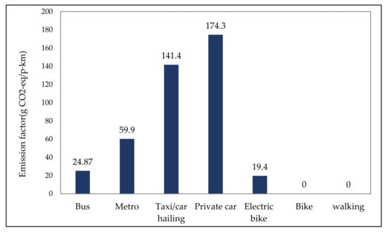 According to the “Didi Platform Green Transport White Paper 2020” released by Didi Chuxing, which is the world’s leading mobility technology platform, Figure 2 shows the GHG emission factors of different transport modes at the use phase []. The calculation is temporarily replaced by the electric bike data when the alternative transportation mode chosen by the respondents is other.