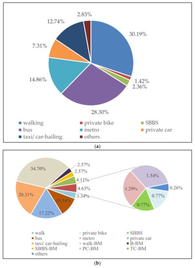 In the sample of Pattern 2, more than 1/3 of the users choose to use walking to connect bus/metro if FFBS connecting public transport is not available, but 43.20% of the users choose motor vehicles or motor vehicles to connect public transport. FFBS connecting public transport has a stronger substitution effect on motor traffic. Meanwhile, fewer respondents use SBBS or private bikes to replace FFBS, which are more flexible, as shown in Figure 3b. Some studies have shown that most people choose to use shared bikes instead of walking or private bikes as a supplement to the public transport after introducing a bike sharing system []. As a short-distance transport mode, the shared bike is a functional replacement for walking and public transport. However, because FFBS has a strong complementarity with public transport, it can more effectively cut the reliance of motor vehicles [,].