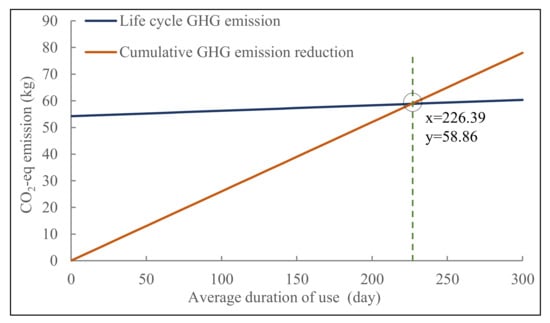 Considering the user heterogeneity, the respondent weighted factor is introduced to characterize the annual behavior of using FFBS. The result shows that the annual emission reduction benefits of FFBS in the use phase are 16.783 tons of CO2-eq in the sample for Pattern 1 and 24.470 tons of CO2-eq in the sample of Pattern 2. Then, according to the proportion of users with different use patterns obtained by the survey, when the number of FFBS users in Nanjing is 1.3 million, 76.96% of the users choose to use FFBS for a direct trip, and 23.04% of the users are used to connect the bus/metro. The existing norms stipulate that the mandatory retirement age of the FFBS is 3 years. When Nanjing has 257,000 FFBS, FFBS generate the net annual environmental benefits for Nanjing transportation sector by 25,195.921 tons of CO2-eq emission reductions in the life cycle. FFBS system has significant environmental benefits and effectively improves the traffic trip structure. However, most respondents only use FFBS for short-distance trips. In short-distance trips, most choose public transport and non-motorized modes as alternatives, so the environmental benefit is not significant. At the same time, in the sample of connecting trips, nearly half of the users are commuter trips, and more than 1/3 of them choose motorized traffic as alternatives. Therefore, strengthening the connection between FFBS and public transport is conducive to alleviating the impact of commuting at the trip peak. The relevant management departments should reasonably arrange parking areas of FFBS near public transport sites and reasonably regulate the number of FFBS in different areas. In addition, as shown in Figure 4, when there are 257,000 FFBS in Nanjing, each bike is used once a day on average, and the average riding distance is 2.2 km, and each bike needs to be used for at least 227 days to achieve zero emissions. The GHG emissions generated in the production, operation, and disposal phases can be offset by using FFBS. However, with the improvement of the FFBS turnover rate, it can reach an equilibrium point faster in the current situation. Furthermore, the management departments should also reasonably determine the inputs number of FFBS with the life cycle concept of FFBS and the actual situation.