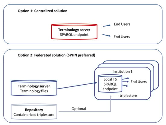 It is the nature of biomedical terminologies to change, for example, as new research findings or adapted coding guidelines need to be reflected. Terms and codes can become deprecated, and new terms are added with new releases. Therefore, a reliable continuous process is required to stay up to date and to keep track of the release cycles of these terminologies. Providing historical versions of terminology is required since researchers receiving real-world data over a large time span need to be able to connect the applicable versions of the terminology to the data they receive from the data provider. While the information itself is present, one of the challenges is to seamlessly integrate and use all of these terminologies, which follow different concept models, and have their own formats and release cycles. Various communities and countries, therefore, host so-called terminology services that provide terminologies in several formats and representations that are compatible with different software applications. The following two architectural designs can be found in the literature (see Figure 1): either a centralized system with one terminology service or a federated design with a local terminology service. The most well-known example of a centralized terminology service is the BioPortal [12] repository, from the National Center for Biomedical Ontology (NCBO), which provides over 900 biomedical ontologies. Another example is Ontoserver [13], which is based on the Fast Health Interoperability Resources (FHIR) standard and includes a syndication mechanism to facilitate the versioning of terminologies. Ontoserver is available via a commercial software license and has been selected by NHS Digital UK and Nictiz Netherlands [14]. Several organizations make use of the HL7 ® FHIR ® Application Programming Interface (API) to enable access to current terminology content, e.g., LOINC is offering the LOINC FHIR Terminology Server [15] based on the HL7 ® FHIR ® API. However, this solution provides access to one single standard and only the current version. The Unified Medical Language System (UMLS) offers a meta-level view on concepts from many biomedical vocabularies and provides a crosswalk between them [16]. It can also be observed that hospitals start to develop their own terminology server in order to increase the quality of the clinical data [17]. All of these solutions have their benefits and advantages specifically targeted to certain application scenarios and they support semantic interoperability.