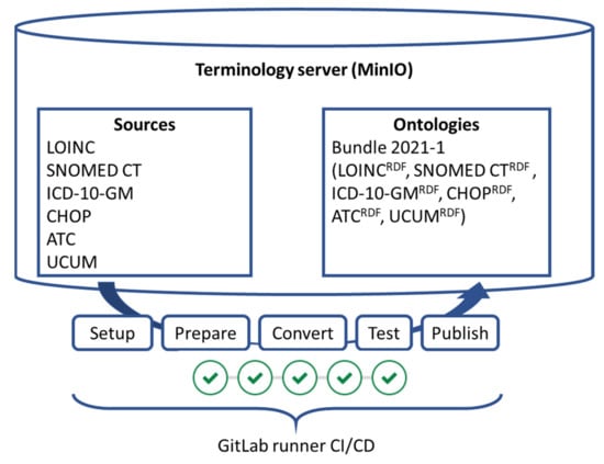 All terminologies are stored in an MinIO server hosted on the BioMedIT node sciCORE at the University of Basel [18]. In the MinIO server, there are the following four folders: sources/current, sources/archive, ontologies/current and ontologies/archive. Input files (original files in .csv, .xlsx, .zip or release format 2 (RF2) for SNOMED CT) are downloaded by the DCC staff and uploaded into the sources/current folder. The GitLab runner CI/CD pipeline (Available online: https://git.dcc.sib.swiss/dcc/biomedit-rdf, accessed on 30 October 2021) includes the following steps (see Figure 2):