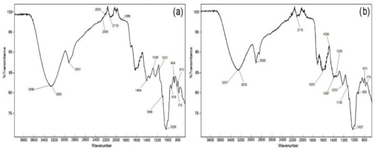 FTIR spectra of (a) tamarillo pulp flour and (b) tamarillo epicarp flour.