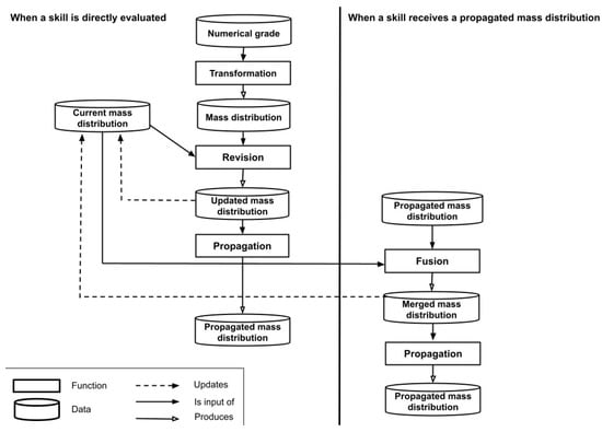 When a skill is evaluated, Diag-Skills receives an evaluation grade. This numerical value is transformed into mass distribution. This latter is used to perform a revision of the current mass distribution. This change in the skill’s mass distribution triggers a recursive propagation to the neighboring skills. When a propagated belief is received, it is merged with the current belief thanks to the Fusion function.