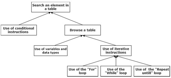 The skills “Browse a table” and “Use of conditional instructions” are prerequisites of the skill “Search an element in a table”; the skills “Use of iterative instructions” and “Use of variables and data types” are prerequisites of the skill “Browse a table”; the skills “Use of the for loop”, “Use of the while loop” and “Use of repeat-until loop” are prerequisites of the skill “Use of iterative instructions”. Each skill can be in one of the following states: acquired, not acquired, probably acquired, probably not acquired, undetermined, or conflictual.