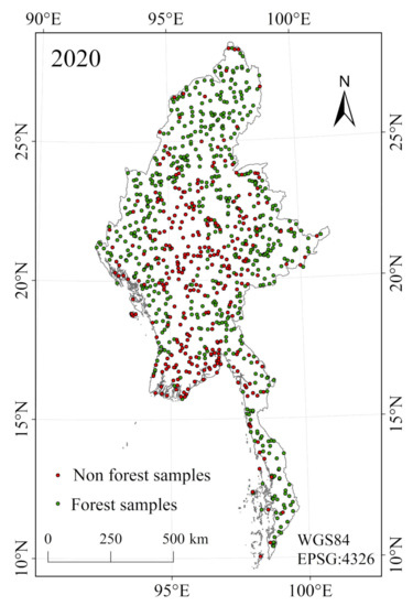 Spatial distribution of forest and non-forest validation samples in Myanmar (2020).