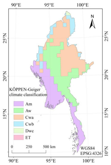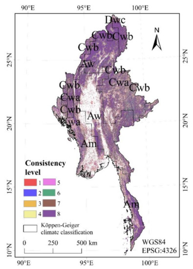 To analyze the driving factors for spatial consistency from the aspects of terrain and climate, we chose (1) the Digital Elevation Model (DEM) data with 30 m resolution from Shuttle Radar Topography Mission (SRTM) [32,33] and calculated the slope data based on it; (2) KÖPPEN-Geiger climate classification [34] scheme includes six climate zones in Myanmar (Figure 2): Tropical Monsoon Climate (Am), Tropical Savanna Climate (Aw), Humid Subtropical Climate (Cwa), Subtropical Highland Climate (Cwb), Sub-boreal Monsoon Climate (Dwc) and Boreal Tundra Climate (ET).