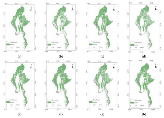 Spatial distribution of forests in Myanmar extracted from eight global land cover datasets. (a) Hansen2010; (b) CCI-LC-2015; (c) FROM-GLC-2015; (d) GLC-FCS-2015; (e) FROM-GLC-2017; (f) FROM-GLC10; (g) GLC-FCS-2020; (h) GlobeLand30-2020.