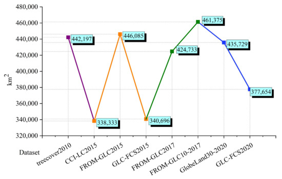 Overall, the eight datasets have a variable distribution of forest areas in Myanmar. The CCI-LC has the least forest area and FROM-GLC10 has the most forest area. Among the three datasets in 2015, the differences in forest area between CCI-LC and GLC-FCS are small, while the forest area of FROM-GLC exceeds the other two datasets by about 100,000 km2. Since they are from the same year, the effect on the change in forest area due to the expansion or reduction of the actual forest area is small. The reason for such a large difference is mainly related to the objective conditions, such as different remote sensing data sources, classification systems, and production methods. The two datasets of 2017 are essentially the same product FROM-GLC. The difference in forest areas is about 40,000 km2 as seen in Figure 4, and is mainly due to different spatial resolutions. The FROM-GLC10 not only has higher mapping accuracy but also has clearer spatial details, more forests can be identified. The difference in forest area between the two datasets in 2020 is about 60,000 km2.