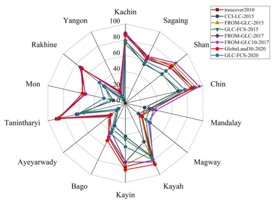 Through the comparison of forest areas, it can be seen that the forest cover in Kachin, Sagaing, Mandalay, Yangon is more similar in different datasets. Kachin and the northern areas of Sagaing are higher in altitude, the landscape pattern is mostly plateau, the mountainous forest features can be better identified [38]. Mandalay, Yangon and southern Sagaing are located on plains. These regions are low and flat and dominated by croplands. Forests are better identified when the surrounding land type is mostly cropland [38].