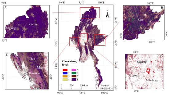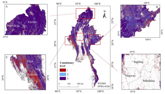 Having fixed the time variables, the forest consistency distribution for the three datasets in 2015 is shown in Figure 7. The sub-areas A-D, respectively, correspond to the sub-areas for the eight datasets. It can be seen that most regions can be guaranteed to have two or more datasets with consistent distributions (Sub-area A and B). Similar to the consistency results for the eight datasets, Rakhine is less consistent, with more areas having a consistency level of 1 (Sub-area C). This is both related to its geographical location and different data sources, classification methods, etc. The “salt and pepper” phenomenon in central Myanmar is less pronounced than in the eight datasets (Sub-area D). The comparison of the three datasets in 2015 removes the effect of time variables, the divergence is mainly related to objective factors in the different datasets.