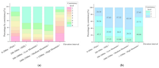 Consistency distribution among different elevation intervals. (a) Eight datasets; (b) Three datasets in 2015.