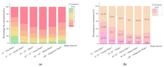 Consistency distribution among different slope intervals. (a) Eight datasets; (b) Three datasets in 2015.