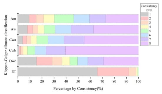The proportion of eight spatial consistency levels in 6 climate zones.