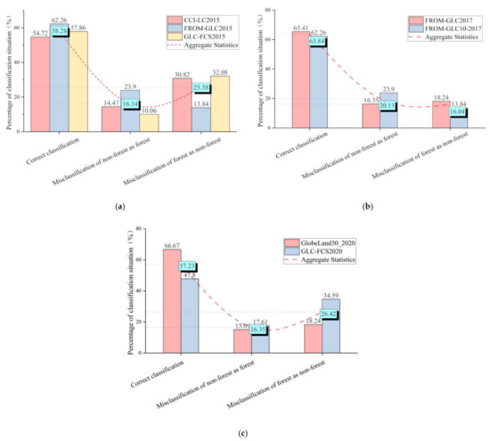 Proportion of forest datasets correctly classified and two incorrectly classified in 2015/2017/2020. (a) Three datasets in 2015; (b) Two datasets in 2017; (c) Two datasets in 2020.