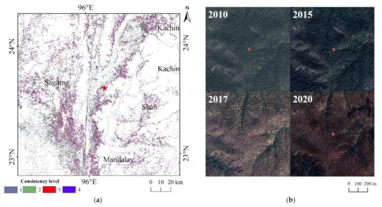 Examples of actual forest change in Myanmar, 2010–2020. (a) Differences between datasets; (b) Actual forest change during 4 years.