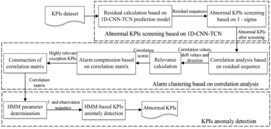 This paper presents an anomaly recognition method. The overall framework of the method is shown in Figure 1, which mainly includes three modules: abnormal KPI screening, alarm clustering, and abnormal detection. Firstly, we propose a 1D-CNN-TCN prediction model. The model is used to learn the characteristics of past data to predict future trends. The difference between a predicted sequence and an actual observation sequence at the corresponding time point is calculated to obtain the residual sequence. The 3-sigma method [26] is used to identify all KPI anomalies at a known time. Based on the residual sequences, a sliding window is added to the correlation analysis of abnormal KPIs to obtain correlation values, shift values, and the order of influences. Through comprehensive analysis of these three factors, final correlations are obtained, and the correlation matrix is constructed to further realize alarm clustering. All parameters of the HMM are determined, including the correlation matrix that has been converted to be suitable as an HMM parameter, and the HMM is trained. Then, other KPIs are found that may cause a certain KPI anomaly using the trained HMM model.