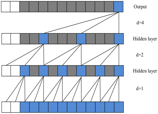 The Convolutional Neural Network (CNN) was first proposed by LeCun et al. [27] and is currently mainly used in the fields of image recognition and natural language processing. 1D CNN is suitable for time series with a one-dimensional structure and has characteristics of easy parallel, and does not induce gradient explosion or error accumulation. However, its ability to capture temporal dependency relations between time series data points is poor. After the continuous optimization and development of a CNN, the Time-Series Convolutional Neural Network (TCN) has appeared. The TCN mainly deals with time-series data, and uses dilated convolution [28] and residual connection [29] to increase the receptive field of a network and accelerate training speed. The general network structure of the TCN algorithm is shown in Figure 2. The TCN can make up for the 1D CNN’s inability to capture temporal dependence, and also has other characteristics of the 1D CNN. The use of expanded convolution not only ensures that the network covers all effective information, but it also enables the deep network to obtain more effective information. The formula of expanded convolution is: