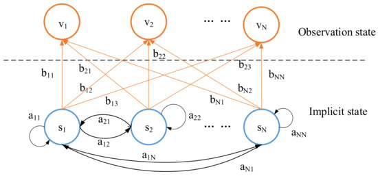 The Hidden Markov Model is a time series probability model that includes a hidden state and an observation state. The implicit state is the actual state within the system, and the observation state refers to the state that can be directly observed, and which has a correlation with the implicit state. The HMM can be described by five elements, including two state sets and three probability matrices. These five elements are the hidden state set , the observation state set , the initial observation probability , the hidden state transition probability matrix , and the observation state transition probability matrix . Generally, HMM is represented as .