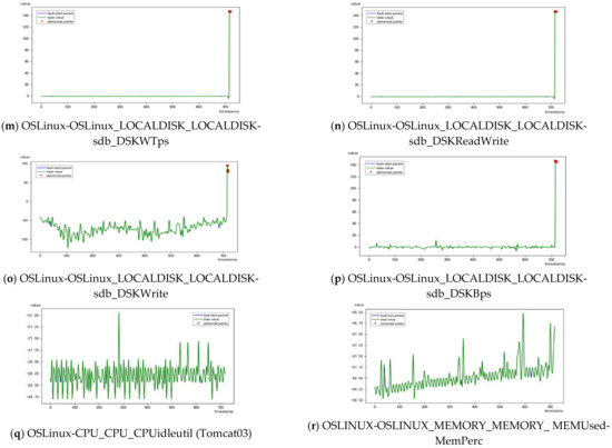 The KPI indexes in Table 1 are filtered to derive KPI indicators with overall anomalies at known times. The anomalies for each KPI are shown in Figure 5. The red annotation in the image shows the suspected anomaly point, and the blue line segment is the starting time of the injection anomalies. In the anomaly detection diagram in Figure 5, the x-axis represents the time in seconds, and the y-axis represents the value of each indicator at each time point. After using the method of this paper to screen the indicators in Table 1, the results are compared with the abnormal time points of specific KPIs given by the competition. If 3-sigma screens out abnormal KPI points, the KPI anomaly is considered in the whole period.