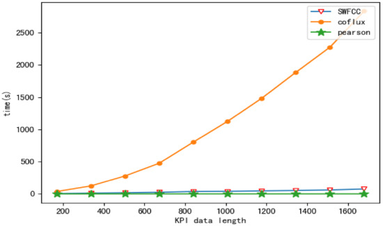 Figure 7 shows the times required for the correlation analyses of SWFCC, Coflux, and Pearson for different lengths of KPIs. It can be seen from the figure that the calculation speed of SWFCC is in the mid-range, and the calculation time increases linearly with the increase in KPI data length. The Pearson method is faster and the Coflux method is slower.