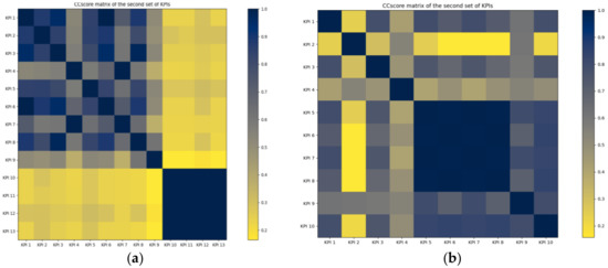 Heat map of KPI correlation matrix: (a) correlation matrix for the first set of KPIs; (b) correlation matrix for the second set of KPIs.